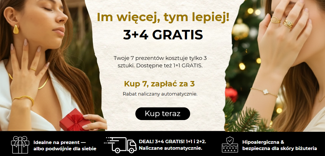 W czasie gifting season nasza misja jest jasna: sprawiać, by szczere gesty naprawdę lśniły. Dlatego dzielimy się naszą najhojniejszą akcją w historii: 3+4 GRATIS na wszystko. To nasze zaproszenie, by obdarowywać więcej.
